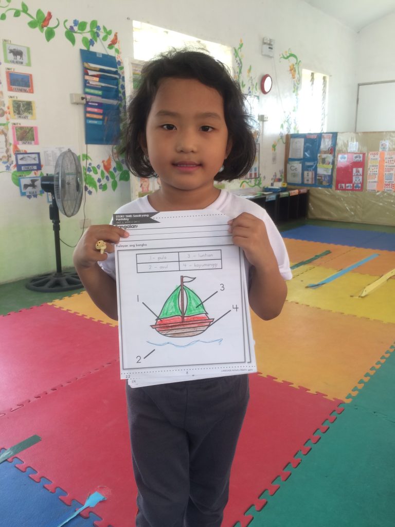 Ayezsa holds up a page of her workbook where she diligently colored a sailboat. She and her peers are not only learning basic colors and numbers but also to follow directions, fine motor skills, arithmetic, and reading comprehension. Ayezsa has grown to be very bright and diligent student at MovEd’s Learning Lab. She knows how to create secondary colors, pick-up after herself and correctly follow instructions.